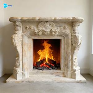 Handgesneden binnendecoratie, natuursteen, handgesneden karakterbeelden, beige marmeren schouwomlijsting